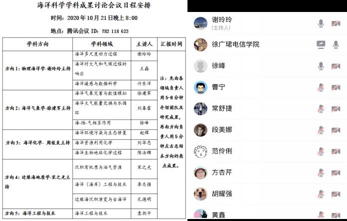 谢玲玲教授首先介绍了本次会议的目的和议程,随后海洋科学5个方向13个领域的负责人(代表)依次对2016年以来本方向本领域所取得的科研成果进行汇报和交流。各位汇报人在简单介绍了团队成员构成、教学和科研情况之后,重点对本领域在科学研究方面的优势和特色成果进行了展示和报告,方向负责人对方向相关领域进展进行了点评和总结。会议持续近2个半小时,不仅展现了海洋科学学科近5年来的“累累硕果”,也展示了海洋科学各方向老师奋力拼搏、努力进取的“海洋精神”。