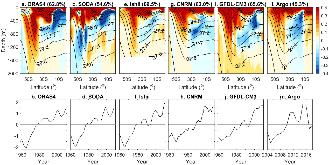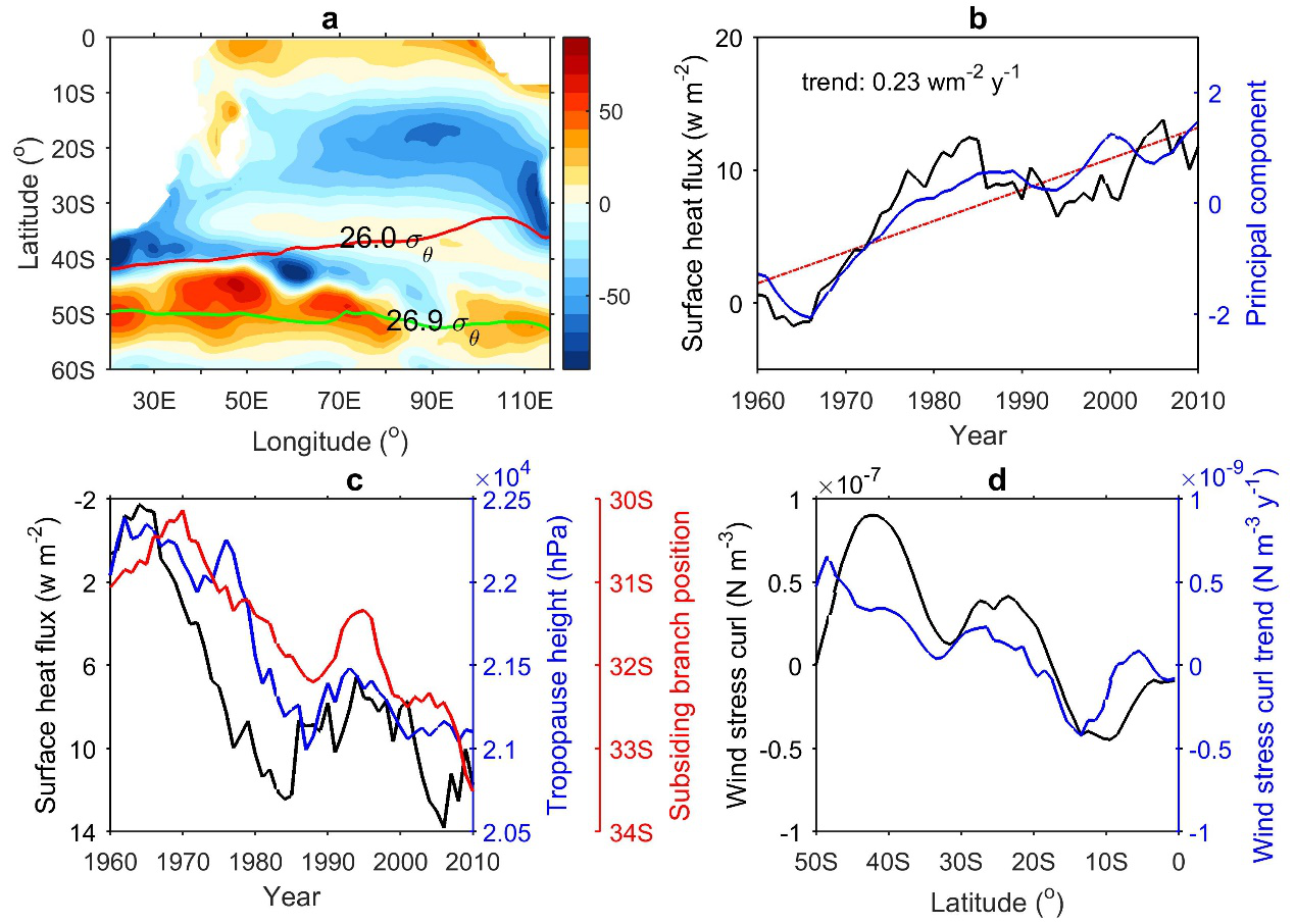 物理海洋学团队基于一系列再分析资料、模式输出和观测资料,发现南大洋正在经历的显著增暖可通过两种途径影响南印度洋次表层海水的热量再分配过程。首先,南大洋海表净热通量的增加导致了表层海水的增暖和局地更为深厚的对流层,通过抑制热带外大气的斜压不稳定迫使Hadley环流下沉支/西风带南移,进而在风应力旋度的驱动下整个副热带环流圈向极地偏移(图2),这导致南印度洋海水在位势密度槽的向赤道一侧变冷,向极地一侧变暖,产生图1所示的时空分布。
