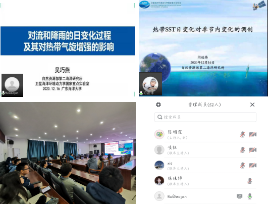 师生作了精彩报告。首先吴巧燕研究员作了题为“对流和降雨的日变化过程及其对热带气旋增强的影响”的学术报告。吴老师在报告中介绍了台风过程中对流和降雨的日变化过程及其对热带热带气旋增强的影响。发现台风降雨和对流的日变化特征,揭示了具有日变化特征的对流过程如何影响台风的结构和强度,从而表明太阳辐射的日夜差异影响台风这种强烈天气过程的可能性。