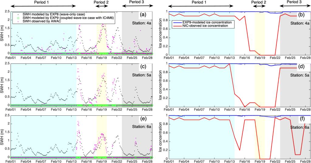 图1.数值实验EXP8、EXP9模拟所得2011年2月份有效波高与AWAC实测有效波高在4a站(a),5a站(c),及6a站(e)处对比情况。数值实验EXP9模拟所得湖冰密集度与NIC湖冰产品在4a站(b),5a站(d),及6a站(f)处对比情况。