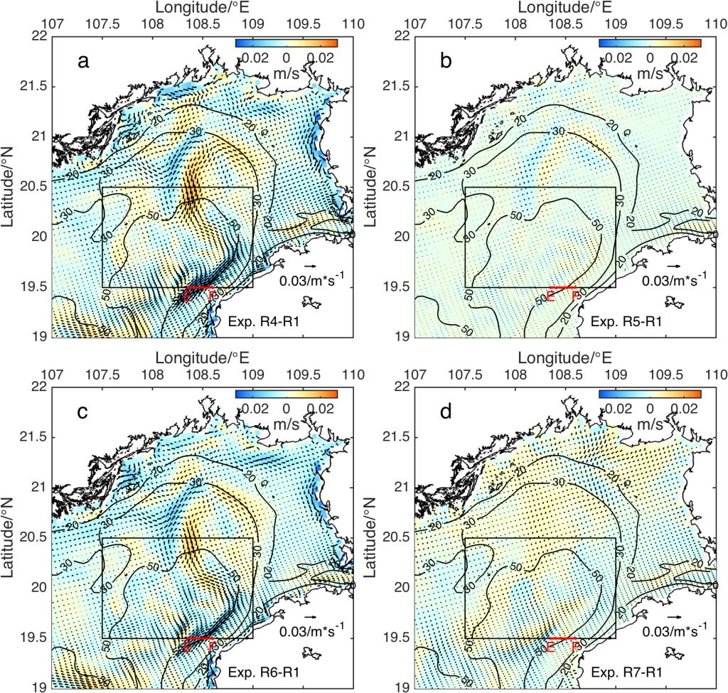 图1.数值实验Exp. R4 (a), R5 (b), R6 (c)及R7 (d)与实验Exp. R1模拟的2014年6月北部湾内深度平均流的差异。图中箭头指示流速的变化方向,颜色代表流速的变化量值,黑色方框标识出北部湾夏季冷水团所在位置,红线为断面EF。
