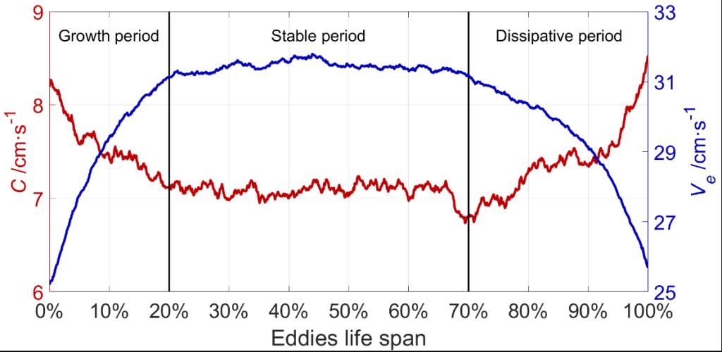 物理海洋团队基于卫星高度计资料,统计分析了南海中尺度涡移动速度的季节、年际以及生命周期的变化。结果显示,中尺度涡南北向移动速度与经向背景流速相关系数达0.96,西向移动速度夏季平均值比冬季低2cm/s,年际高值多发生在太平洋年代际振荡(PDO)为负位相的拉尼娜年。速度随生命周期的变化可分为生长期(前20%)、稳定期(30-70%)和耗散期(后30%)三个阶段。在生长期,涡旋移速逐渐变慢,转速加快;在稳定期,涡旋移速和转速分别稳定在7.0-7.2 cm/s和31.0-31.5 cm/s;当涡旋达到其寿命的70%时移速最慢,随后开始加快,而转速逐渐减小,直到涡旋消亡。中尺度涡移速和转速在其生命周期内的相关系数达到-0.93。该工作提出了中尺度涡移动和旋转能量之间的转化,并强调了大尺度环流对中尺度涡移动速度的调控作用。