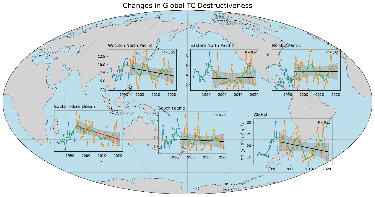 1 | 热带气旋年累积功率耗散指数(PDI)在每个海盆和全球的时间序列。阴影区域是线性拟合直线的双边95%置信区间;实线(红色为线性趋势显著,黑色为不显著)代表自20世纪90年代中期以来的线性回归;绿色曲线代表PDI的五年滑动平均。