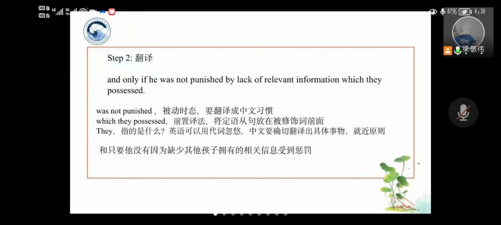 紧接着梁敬伟老师继续以启发式教学引导我们,提出“词组”或“句子”修饰“词”时该如何翻译,对于定语是前置翻译还是后置翻译的问题,引导我们进一步思考,加深了我们对定语在句中成分中的更深层次的理解,清晰地给同学们讲述翻译的具体步骤,断句、翻译、重读整理。