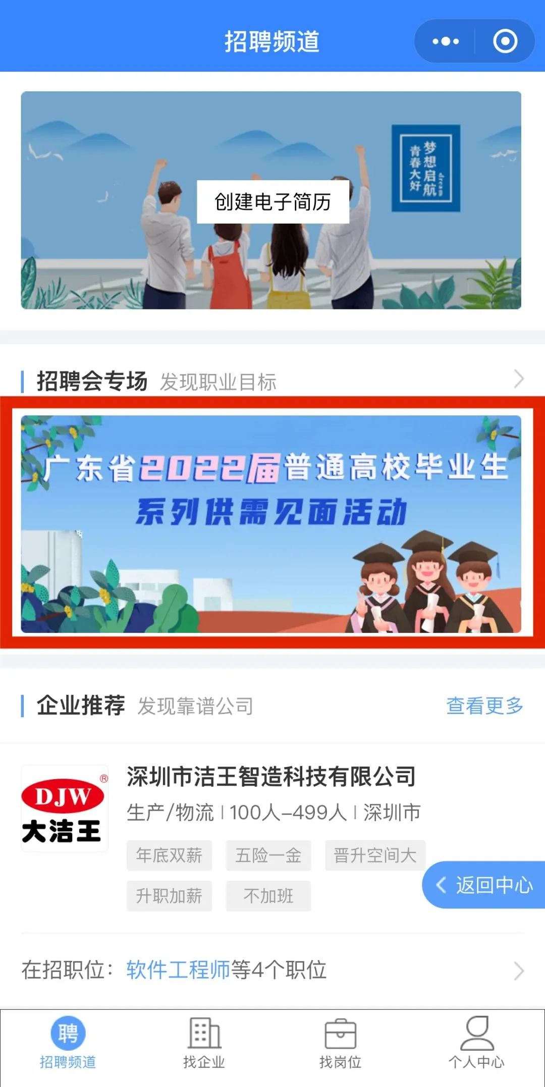 招聘会采用线上举办的模式,依托广东省高校毕业生就业创业智慧服务平台开展。可在“广东大学生就业创业”微信小程序线上投递,步骤如下: