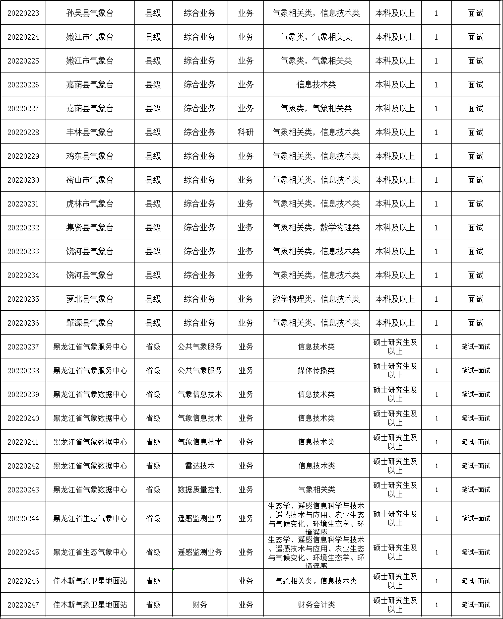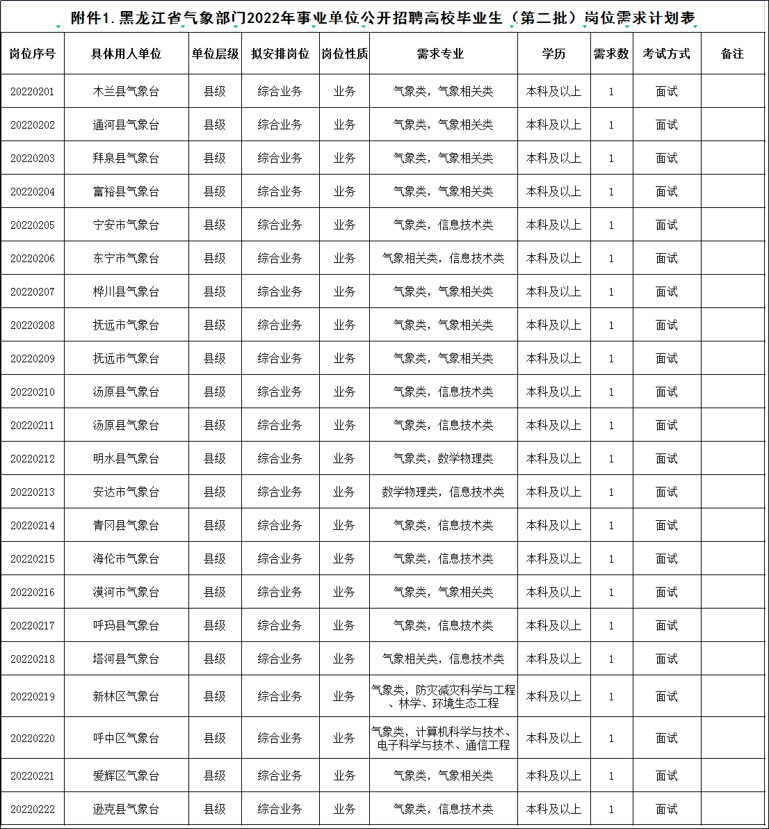 附件1.黑龙江省气象部门2022年事业单位公开招聘高校毕业生(第二批)岗位需求计划表