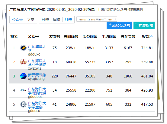 同时,工作室继续做好“新云天气象”公众号的运营,建立师生工作微信群,通过在线采编,集思广益,推送了《坚守!中南地区疫情防控通用航空气象服务平台上线!》《广东省气象大喇叭打通乡村防疫宣传“最后一公里”》等介绍气象人抗击疫情事迹的文章。公众号2020年2月共发布推送文章220篇,实现总阅读数超7.6万人次,微信影响力指数(WCI)达461分,成功进入888娱乐城