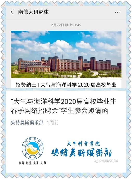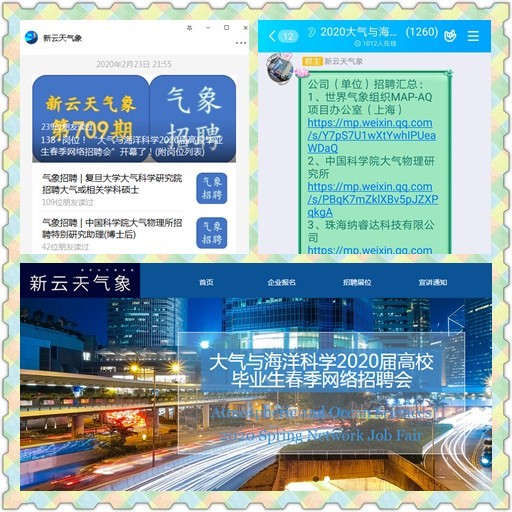 对毕业生就业工作的相关要求,新云天气象工作室举办的“大气与海洋科学2020届高校毕业生春季网络招聘会”通过互联网正式开幕,为2020春季全国首个大气与海洋类招聘会。工作室全体同学及校内外导师克服部分企事业单位尚未复工等困难,成功邀请到复旦大学大气研究院、中科院大气所、南信大气象科技研究院、粤港澳大湾区气象监测预警预报中心、象辑科技、中科三清等12家知名企事业单位进入通过“新云天气象”微信公众号、QQ群和网站(//www.xytqx.com/)搭建的虚拟展位,开展“空中宣讲”“在线面试”等招聘活动,提供高质量就业岗位近200个,涵盖大气科学、海洋科学等888娱乐城