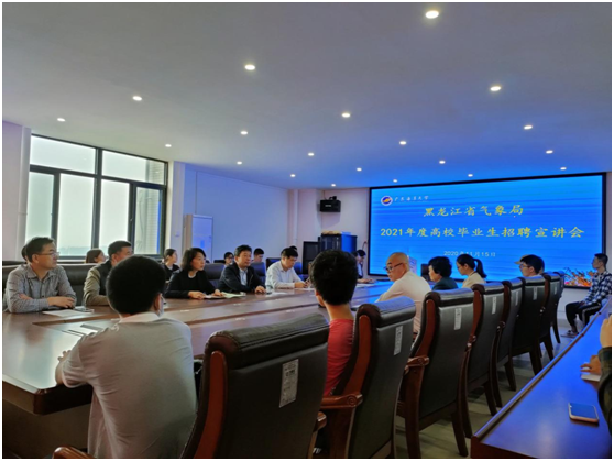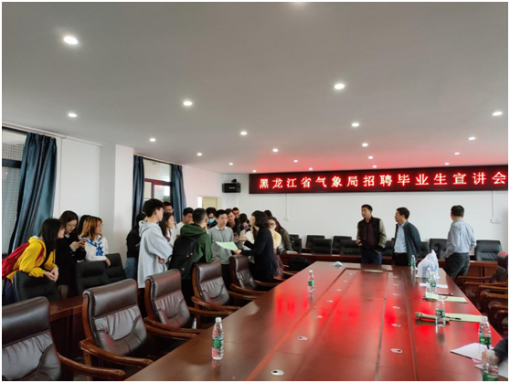黑龙江省气象局副局长那济海向同学们介绍了黑龙江省的美丽风光,向同学们介绍了黑龙江省气象局以及下属各市县局的基本架构、工作体系、人才培养制度、发展前景等基本情况,并向同学们播放了宣传片《博弈黑龙江》。随后,参加招聘会的同学积极提问交流,提出了自己对未来就业方面的一些疑问,一批同学参加了现场招聘面试。