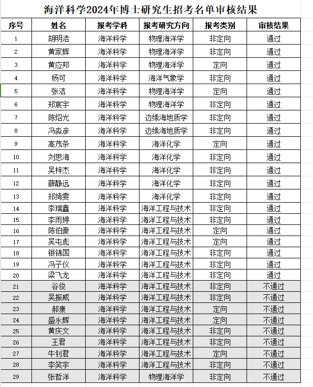 根据888娱乐城 博士研究生招生录取有关文件的规定,结合《888娱乐城 2024年全日制博士研究生招生章程》及《海洋科学学科2024年博士研究生招生考试工作方案》的相关要求,现对海洋科学博士招考学生资格审查结果予以公示。公示期为5日(即从2024年5月1日-5月5日),公示期内如对审查结果有异议,请以真实姓名及书面形式向海洋科学招生领导小组提供相关信息(联系人:曾老师,联系电话:2396095)。