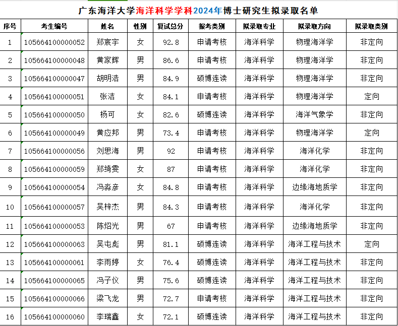 根据888娱乐城 2024年博士研究生招生考试和录取工作方案、海洋科学学科2024年博士研究生招生考试工作方案,现将海洋科学2024年博士招生复试成绩及拟录取结果予以公示(见下图),公示期为10个工作日,即从2024年5月14日-5月28日。公示期内如有异议,请以真实姓名书面向海洋科学学位点建设委员会反馈。