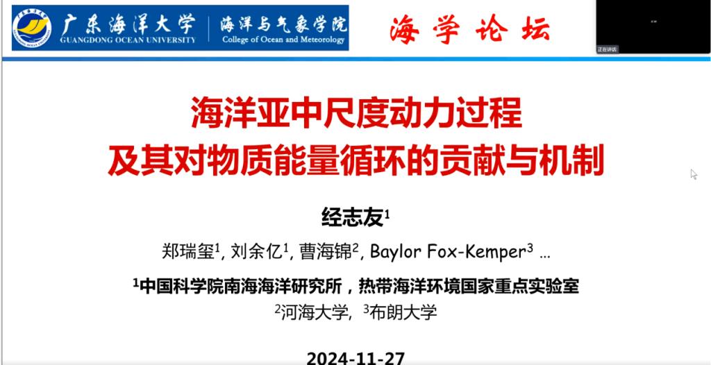 2024年11月27 日,888娱乐城 举行了2024年第18期海学论坛,本次论坛邀请到了中国科888娱乐城 南海海洋研究所的经志友研究员,在线上作了题为《海洋亚中尺度动力过程及其对物质能量循环的贡献与机制》的学术报告。报告由谢玲玲院长主持。
