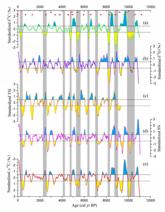 海洋地质团队成员黄超经过反复的条件实验,建立了适合泥炭岩芯样品的α-纤维素提取方法,基于在北疆阿勒泰山获取的长达7.5m的泥炭岩芯,开展α-纤维素碳同位素研究,并结合在泥炭地海拔梯度上开展为期2年的现代观测结果(图1),论证了阿勒泰泥炭α-纤维素碳同位素是一个比较可靠的古温度指标,重建了该研究区域过去11500年以来夏季温度的演化历史(Rao and Huang, 2019)。并且发现该区域夏季温度还呈现千年尺度和百年尺度的波动变化特征。千年尺度上,阿勒泰泥炭α-纤维素碳同位素清晰的记录了数次明显的气候突变事件,与北大西洋浮冰碎屑事件具有较好的对应关系(图2),说明北大西洋的温度变化可通过西风环流对中亚干旱区的温度产生一定的影响。百年尺度上,将阿勒泰泥炭α-纤维素碳同位素记录、太阳活动指标(TSI、SN以及△14C)同时进行标准化处理,剔除长期变化趋势,获得百年尺度的变化信息,并进行对比分析。结果发现,阿勒泰地区的夏季温度的异常变化刚好与减弱的太阳活动吻合(图3),说明百年尺度上阿勒泰地区的夏季温度变化主要受到太阳活动的影响。为了进一步确定阿勒泰地区夏季温度与太阳活动之间的关系,我们对阿勒泰泥炭记录与太阳活动指标SN和△14C分别进行时间序列的滤波分析和交叉谱分析,结果发现存在数个显著的百年太阳活动周期。这些对比分析进一步表明,阿勒泰地区百年尺度的温度异常变化受控于太阳活动的影响。