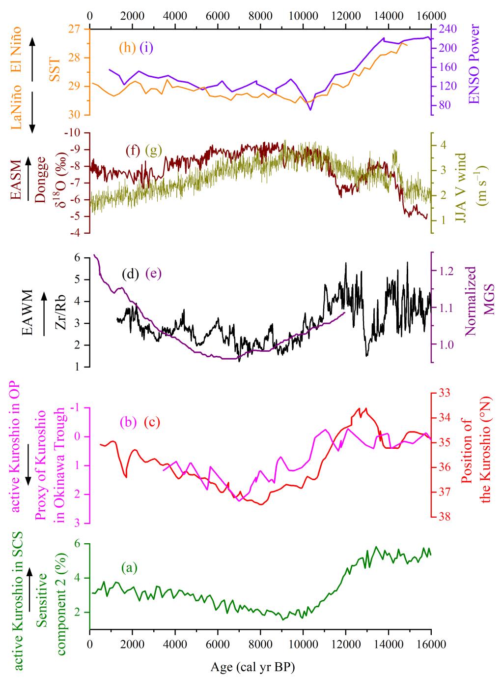 3末次冰消期以来黑潮入侵强度与东亚季风和ENSO活动的关系。图a为本研究敏感粒度组分2指示的黑潮入侵南海的强度变化;图bc为开放太平洋黑潮主轴的强度;图de为东亚冬季风记录;图fg为东亚夏季风记录;图hiENSO活动记录。